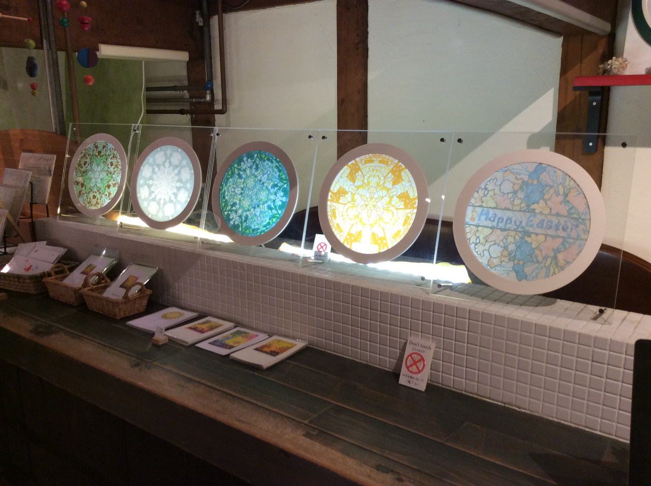 キンダーリープで働く中で「トランスパレントペーパー」「ローズウインドウペーパー」に出会い、仕事の一環として切り絵や、切り絵の一種であるローズウインドウ作品の制作に取り掛かりました。