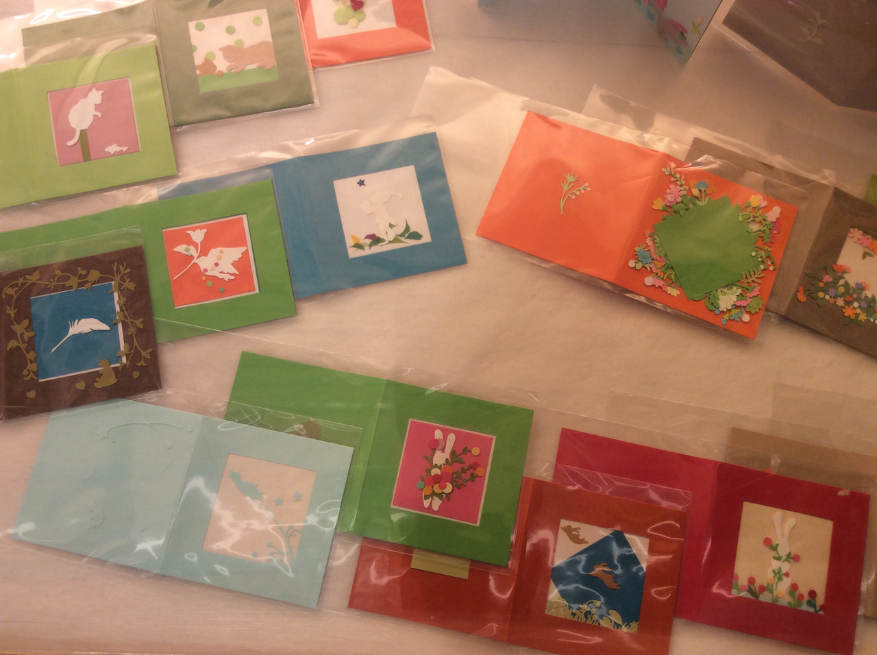 オリジナルカードに使われているちいさなパーツは、「穴あけパンチ」などの道具や「レーザー」などの機械を使っていると誤解されるほど細かいのですが、こちらもすべて「はさみ」による手作りです。その作業を目の前で見て初めて納得される方が多い、というのもわかる気がします。