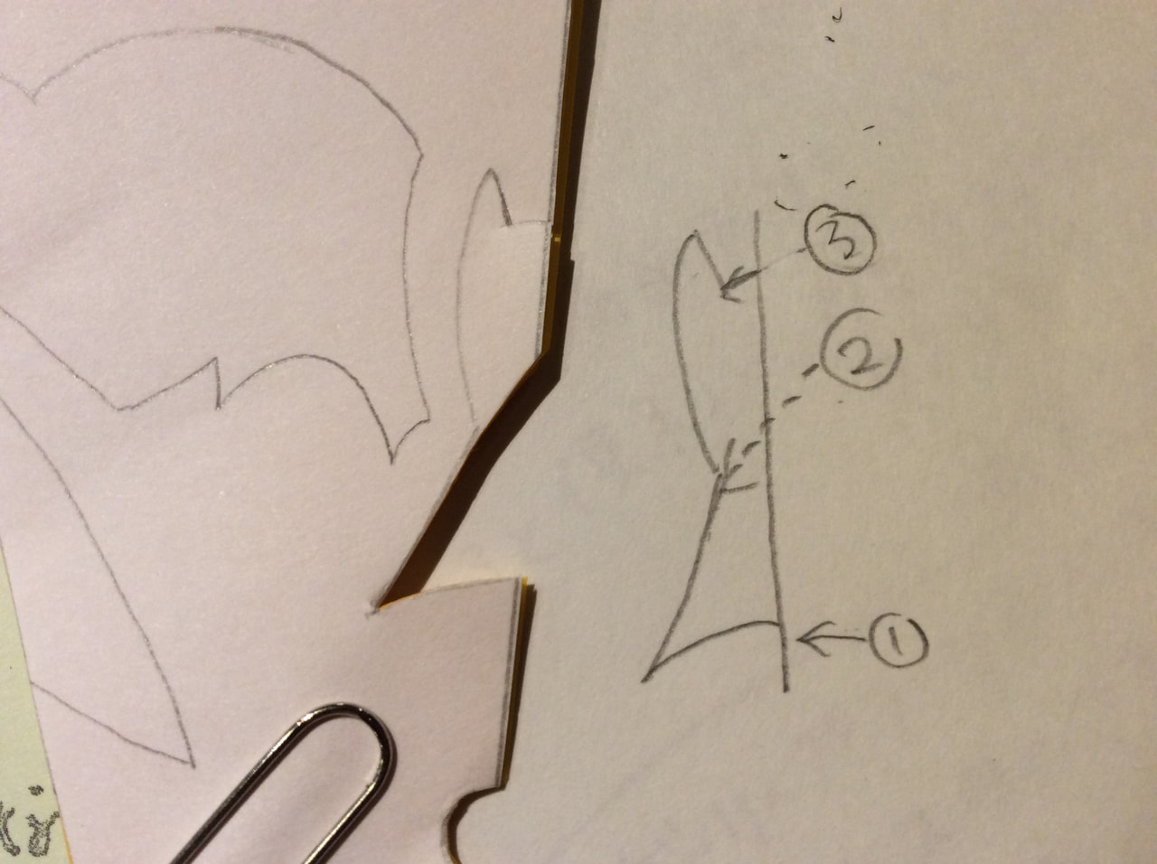 今月号の図案ではありませんが、「いらないところを細かく切り落とす」イメージ図です。②の点線部分ではさみをいれると、とんがり部分ではさみを切り返す必要もなく切りやすいです。この要領でとんがり部分を「すそ」の両方から切り進めると、切りくずは格段に増えますが、気持ちよく切り進めることができます。