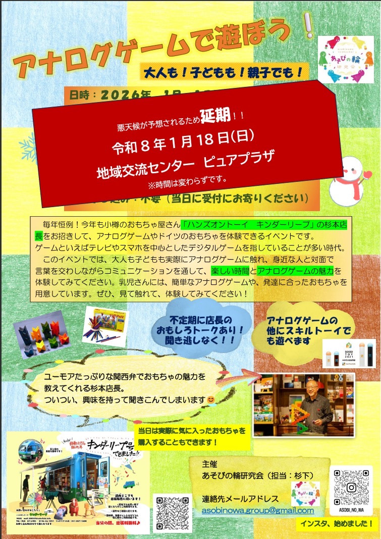 SNSでは告知しておりますが、1月31日(土)13:00~16:00ごろまで さとーふぁみりあさまのゲーム体験会も予定されています。