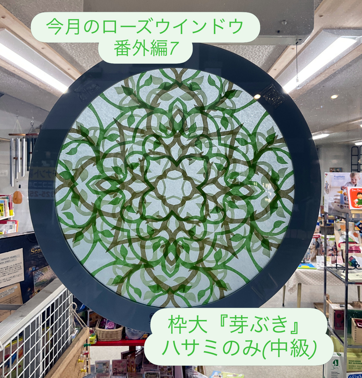こんな感じかな~~とデザインをして、実際に作ってみると案外切るのも大変で、貼り合わせるのにも一苦労しましたので「中級」としています。(てしごとは大好きでもローズウインドウはニガテなスタッフ(さ)は、「これはムリだわ~~」と言っていましたが…。)