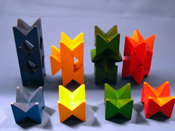 とんがっている部分は、5㎜角の四角になっていますので、左端の青のように、慎重に積むと積み重ねることができます。(キンダーリープの見本1のように、長年愛され、使い込まれているものの中には、この積み方ができないこともあるのですが・・。)一番安定しているのは、右端の赤のように組み合わせる方法。