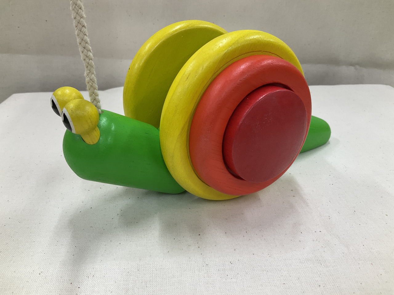 かたつむりの「から」である中央の丸い部分にあたまとしっぽが取り付けてありますが、その部分が中心ではなく外側についていることによって、「しゃくとり虫」のように動きます。大人もつい引き込まれるなめらかさです。